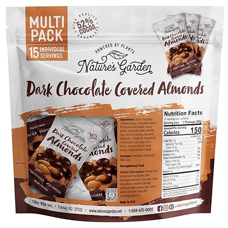 Thông tin sản phẩm Nature's Garden Dark Chocolate Covered Almonds Snack Packs – No Trans Fat, Indulgent Snack, Dark Chocolate Almonds, Kosher Certified – 1 Oz Bags (15 Individual Servings)