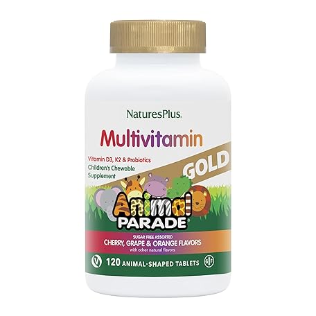 Thông tin sản phẩm Natures Plus Animal Parade Gold Children's Multivitamin - 120 Animal-Shaped Chewable Tablets - Assorted Cherry, Orange & Grape Flavors - Vegan, Gluten Free - 60 Total Servings
