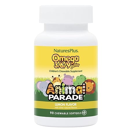 Natures Plus Animal Parade Omega 3/6/9 Junior, Lemon Flavor - 90 Softgels - Promotes Children’s Immune, Skin, Eye & Nervous System Health - Non-GMO, Gluten Free - 45 Servings