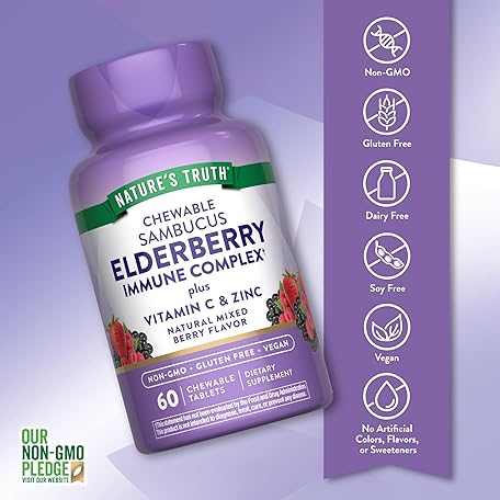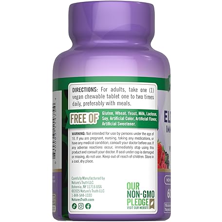 Thông tin sản phẩm Nature's Truth Elderberry Immune Complex | 60 Chewable Tablets | Plus Vitamin C & Zinc | Mixed Berry | Vegan, Non-GMO, & Gluten Free Supplement
