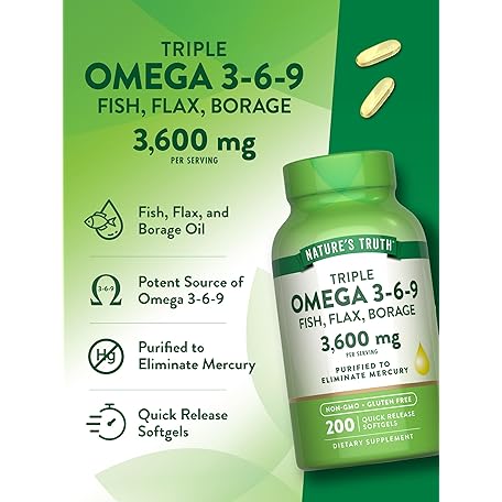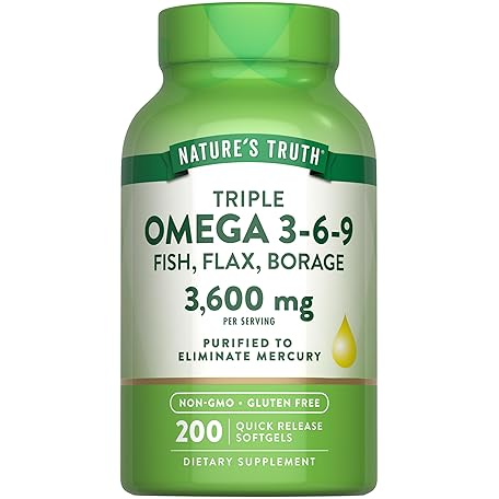 Thông tin sản phẩm Nature's Truth Triple Omega 3 6 9 | 3600mg | 200 Softgels | Fish, Flax, and Borage Oils | Non-GMO & Gluten Free Supplement
