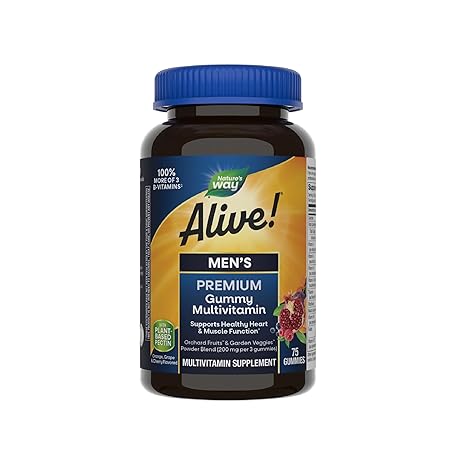 Thông tin sản phẩm Nature's Way Alive! Men's Premium Gummy Multivitamin, Supports Healthy Heart, Muscle Function*, Full B-Vitamin Complex, Orange, Grape, Cherry Flavored, 75 Gummies (Packaging May Vary)