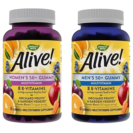 Thông tin sản phẩm Nature's Way Alive! Women’s and Men’s 50+ Gummy Multivitamins, B-Vitamins, Delicious Flavors, 60 Gummies Per Bottle