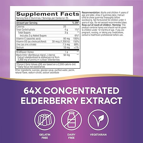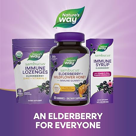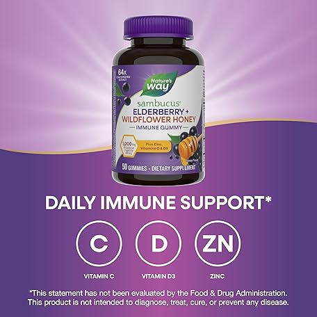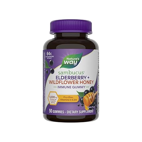 Nature’s Way Sambucus Elderberry + Wildflower Honey Immune Gummy, Daily Immune Support for Adults and Kids Ages 4+*, Vitamins C & D3, Zinc, Vegetarian, 50 Gummies