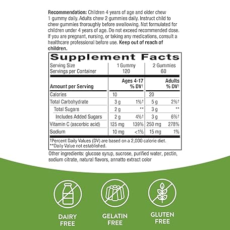 Thông tin sản phẩm Nature's Way Vitamin C Gummies, Support Immune Health*, Antioxidant, 250 mg per 2-gummy Serving, Gummy Vitamins, Orange Flavored, 120 Gummies