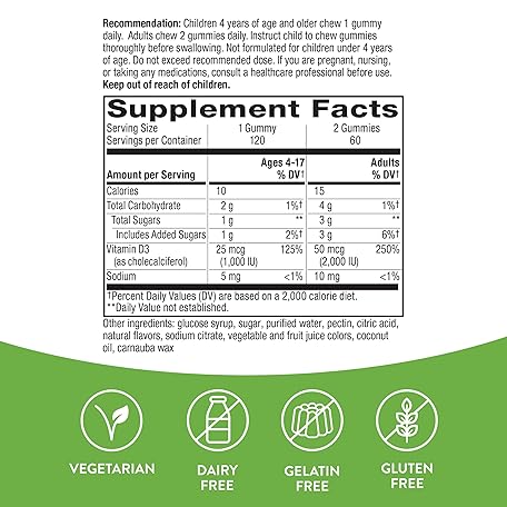 Thông tin sản phẩm Nature's Way Vitamin D3 Gummies, Supports Immune and Bone Health*, 2000 IU (50 mcg) per 2-gummy Serving, Vitamin D3 2000IU per 2 Gummies, Mixed Fruit Flavored, 120 Count