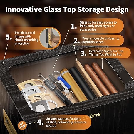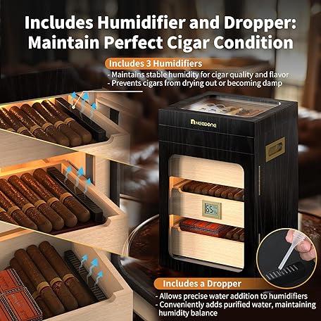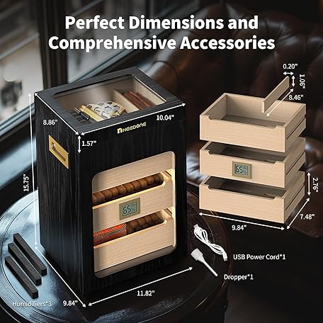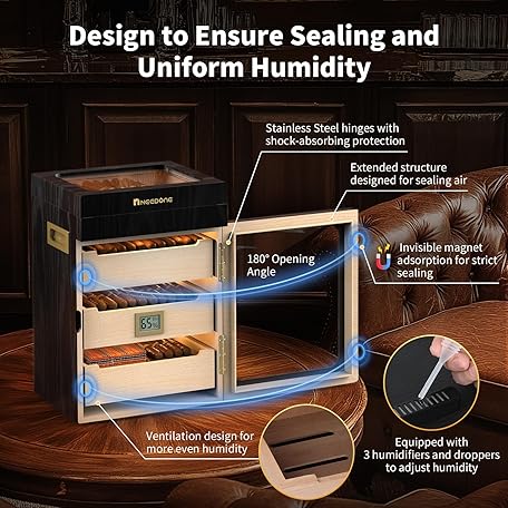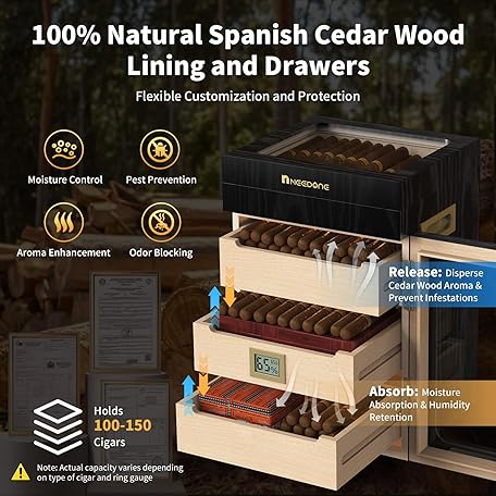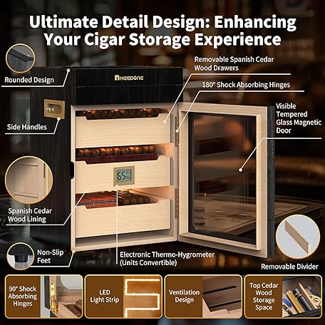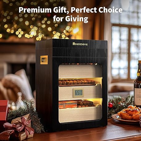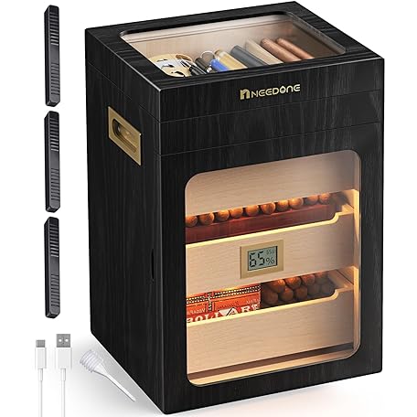 NEEDONE Cigar Humidor, Desktop Humidor Box Case, Wooden Cabinet for 150 Counts w/ 3 Humidifier, 3 Spanish Cedar Wood Drawer, Hygrometer, LED Lighting Cigar Accessories, Gifts for Men Father's Day