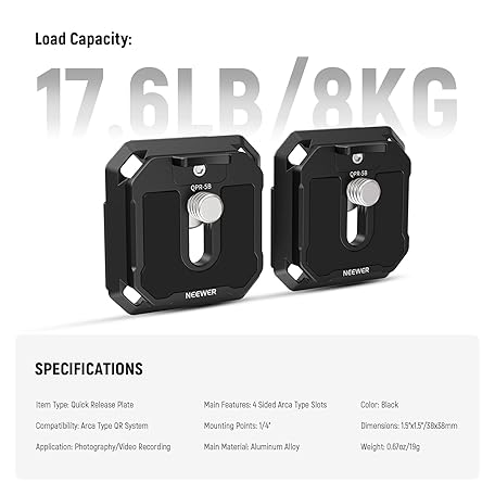 Thông tin sản phẩm NEEWER 38mm Square Quick Release Plate 2 Pack, Anti Off Arca Type QR Camera Mount Plate Compatible with PD Camera Clip Shoulder Strap Tripod Head, 17.6lb/8kg Max Load, QPR-5