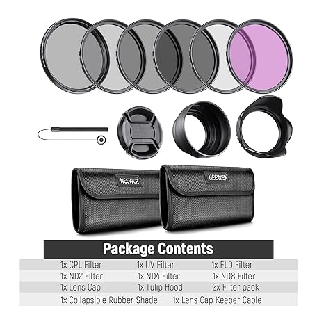 Thông tin sản phẩm NEEWER 58mm ND Lens Filter Kit: UV, CPL, FLD, ND2, ND4, ND8, Lens Hood and Lens Cap Compatible with Canon Nikon Sony Panasonic DSLR Cameras with 58mm Lens