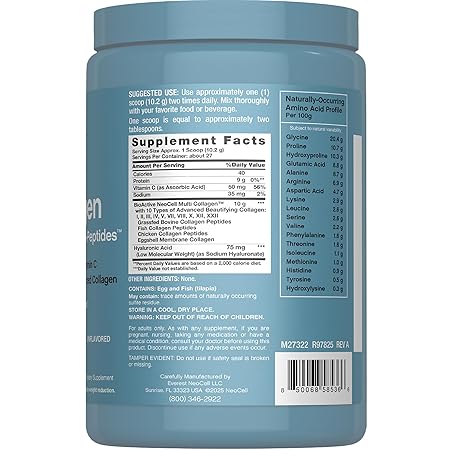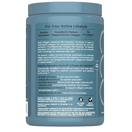 NeoCell Multi Collagen Bio-Peptides Powder | 22oz | Advanced with Hyaluronic Acid and Vitamin C | 10 Super Types of Collagen | Superior Absorption | Grassfed Protein Supplement