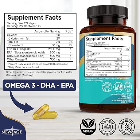 Thương hiệu NEW AGE là cái tên nổi tiếng được rất nhiều khách hàng trên thế giới chọn lựa. Với kiểu dáng đẹp mắt, sang trọng, sản phẩm NEW AGE Omega 3 Fish Oil 2500mg Supplement Non GMO - EPA, DHA Fatty Acids Gluten Free (180 Softgels (Pack of 2)) là sự lựa chọn hoàn hảo nếu bạn đang tìm mua một món cho riêng mình.