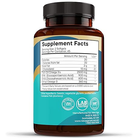 Sản phẩm NEW AGE Omega 3 Fish Oil 2500mg Supplement Non GMO - EPA, DHA Fatty Acids Gluten Free (180 Softgels (Pack of 2)) đang được bán với giá ưu đãi là $38.0955 tại nước Mỹ.