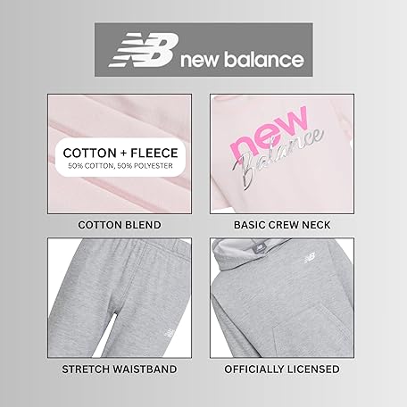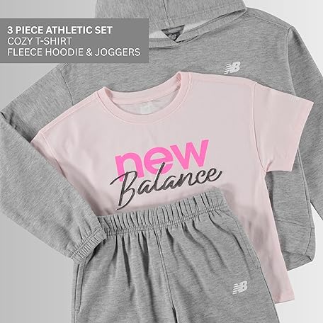 New Balance Girls 3pc Sweatsuit - Cotton Blend Fleece Activewear Set - Pullover Crewneck Hoodie, T-Shirt, Jogger, (4-12)