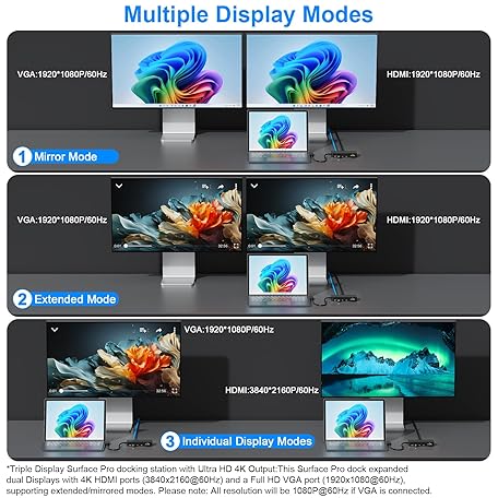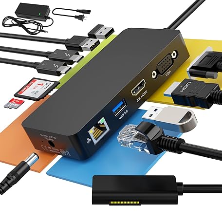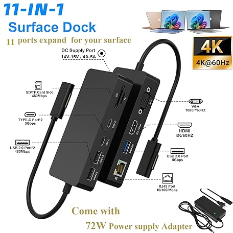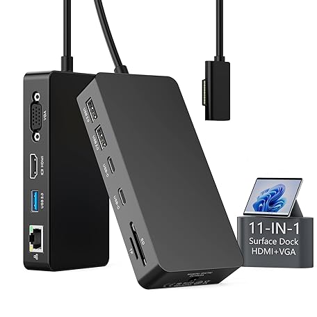 New MS Surface Pro Docking Station Triple Display with 4K@60Hz HDMI+VGA, 11 in 1 Surface Dock 2 with Power Adapter for Microsoft Surface Pro 11/10/9/X/8/7/6/5/4/3,Surface Laptop 7-1, Surface Go/Book