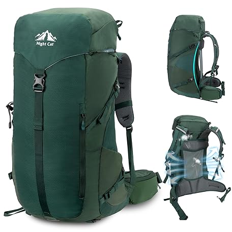 • Night Cat Internal-frame Hiking Backpack: 50L Camping Backpack for Men Women Lightweight Waterproof Rain Cover Green