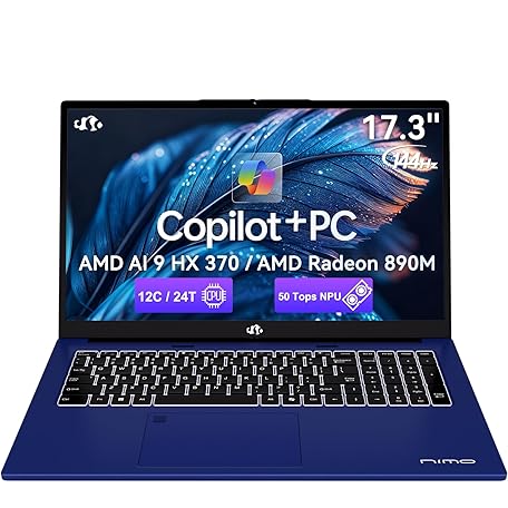NIMO 17.3" AI Laptop, AMD Ryzen AI 9 HX 370(50 Tops NPU), Radeon 890M, 32GB RAM 1TB SSD, DDR5, 144Hz, PD 100W USB-C 4.0, Copilot+ PC AI Laptop with Wi-Fi 6E for Working Business Student