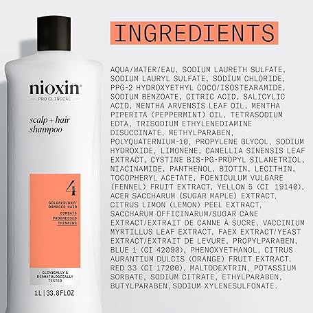 Thông tin sản phẩm NIOXIN System 4 Scalp + Hair Thickening Shampoo for Colored, Dry, & Damaged Hair with Progressed Thinning | Maintain Vibrant Color | Cleanse, Nourish & Boost Hair Density with Niacinamide & Biotin