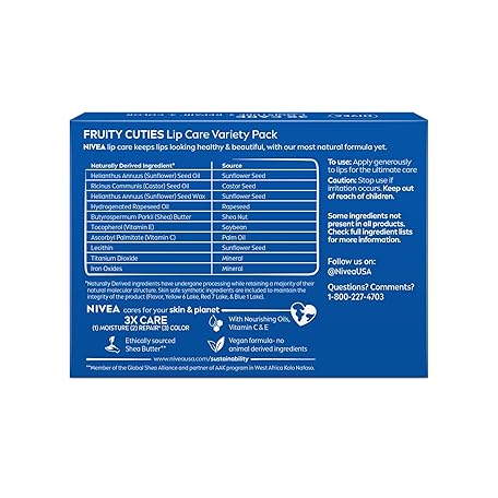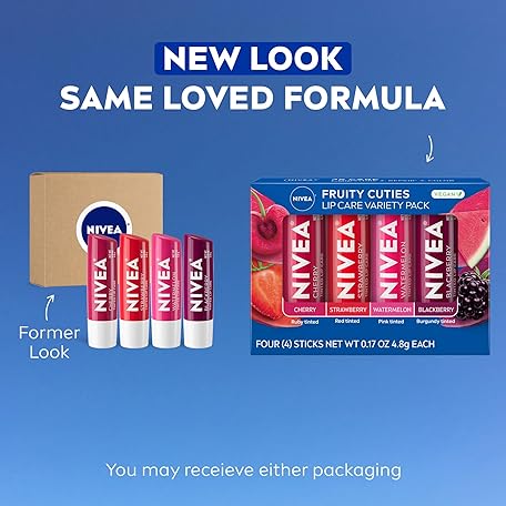 Thông tin sản phẩm NIVEA Lip Care, Fruity Tinted Lip Balm Variety Pack, Holiday Lip Balm Gifts for Her, With Cherry, Strawberry, Blackberry and Watermelon Flavors, 0.17 Oz Stick, Pack of 4