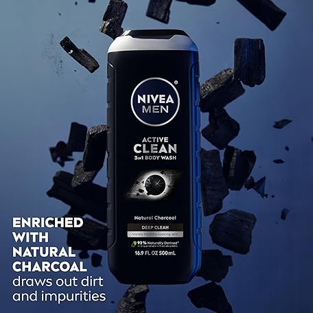 Thông tin sản phẩm NIVEA Men Active Clean Body Wash with Natural Charcoal for Normal to Oily Skin, 3-in-1 Charcoal Body Wash, Face and Hair, Draws Out Dirt and Impurities, 16.9 Fl Oz Bottle, Pack of 3