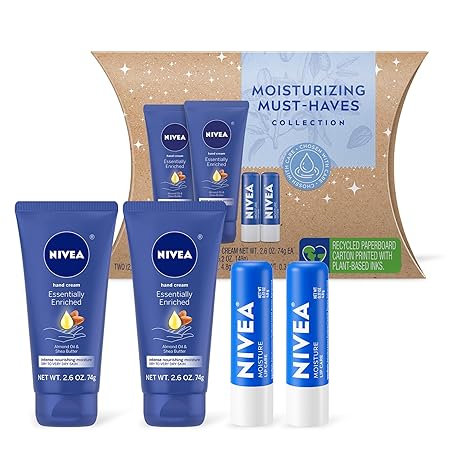 Thông tin sản phẩm NIVEA Moisturizing Must-Haves Skin Care Set, Essentially Enriched Hand Cream with Almond Oil and Shea Butter, 2.6 Oz Tube (Pack of 2) + Moisture Lip Care Lip Balm, 0.17 Oz Stick (Pack of 2)