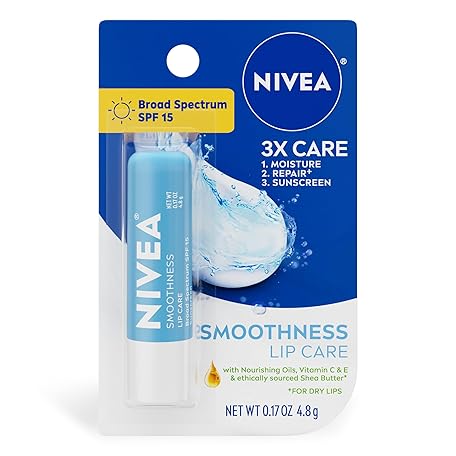 Thông tin sản phẩm NIVEA Smoothness Lip Care, Sunscreen Lip Balm with SPF 15 Broad Spectrum, Shea Butter, Nourishing Oils and Vitamin C & E, 3-in-1 Moisture, Repair (for Dry Lips) and Sunscreen, 0.17 Oz Stick