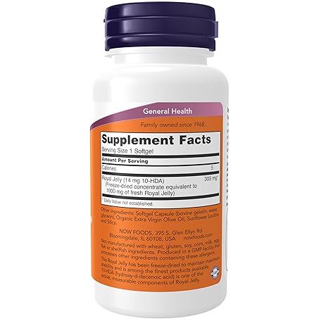 Thông tin sản phẩm NOW Foods Supplements, Royal Jelly 1000 mg with 10-HDA (Hydroxy-D-Decenoic Acid), 60 Softgels