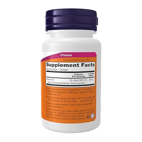 Thông tin sản phẩm NOW Supplements, Vitamin D-3 400 IU, Strong Bones*, Structural support*, 180 Softgels