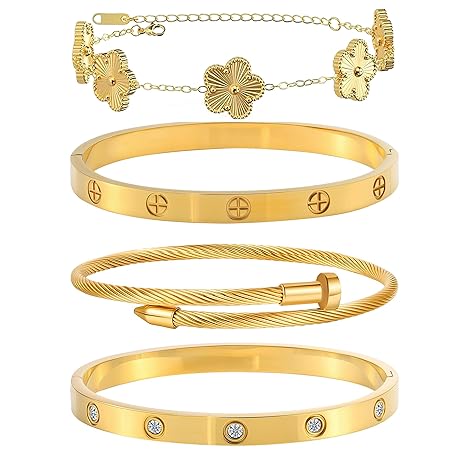 Ntutrxk Gold Bracelets for Women- 4Pcs 18K Gold Plated Stackable Floral Clover Bracelets ,Stainless Steel Bangle Non Tarnish, Gold Bracelet Set Trendy Jewelry,Christmas Valentines Birthday Gifts-Pulseras Para Mujer