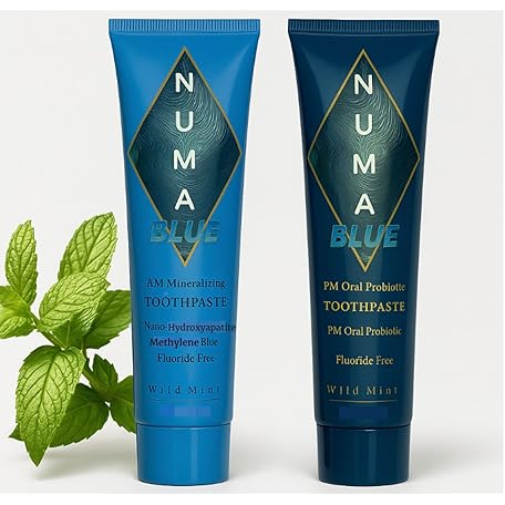 Numa Blue AM & PM Toothpaste with Methylene Blue, Nano-Hydroxyapatite, Probiotics, Fluoride Free, Wild Mint 3.4 OZ Pair