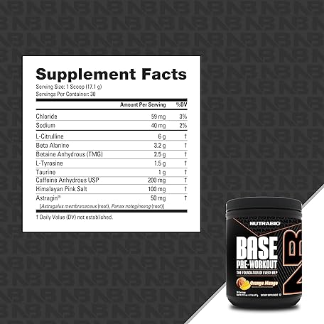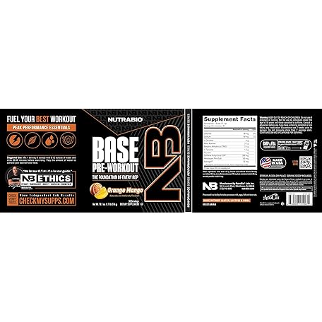Thông tin sản phẩm NutraBio Base Pre-Workout Powder 200mg Caffeine, Sustained Energy, Focus, Endurance, Pump, Sugar Free, Clean Preworkout for Men and Women - Beta Alanine, L-Tyrosine, 30 Servings - Orange Mango