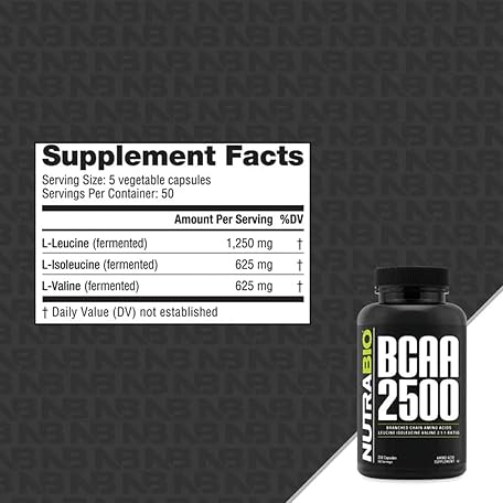• NutraBio – BCAA 2500 – Branched Chain Amino Acids – Support New Muscle Growth and Prevent Muscle Breakdown – 250 Capsules