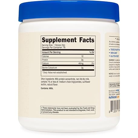 Thông tin sản phẩm Nutricost Colostrum Powder 8 oz, Lactoferrin and Minimum 30% Immunoglobulins (IgG), from Bovine Colostrum, 3g Per Serving, 76 Servings