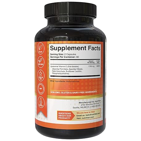 Thông tin sản phẩm NutriFlair Liposomal Vitamin C 1700mg, 180 Capsules - High Absorption, Fat Soluble VIT C, Higher Bioavailability Immune System Support & Collagen Booster, Non-GMO, Vegan Pills