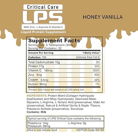 Nutritional Designs LPS Liquid Collagen & Whey Protein Supplement, Sugar-Free, Non-GMO Drink, Promotes Healthy Skin & Hair for Men & Women. (Critical Care) Honey Vanilla