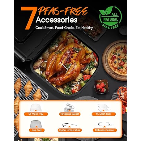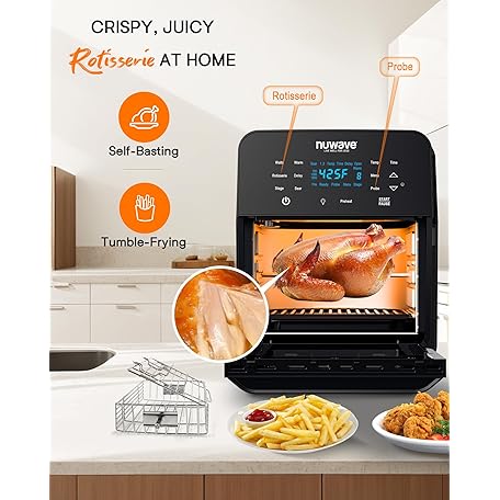 Thông tin sản phẩm Nuwave Brio 15.5Qt Air Fryer Toaster Oven & Rotisserie Kit, 2024 New Advanced Turbo Convection Tech, Healthy PFAS Free, Max Even & Crisp, Powerful 1800W, 50-425°F, 150 Presets, Smart Probe, 4 Rack