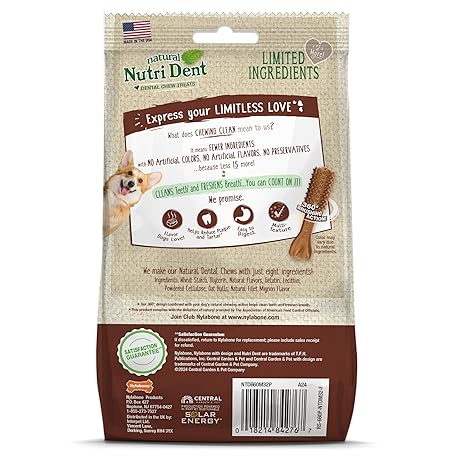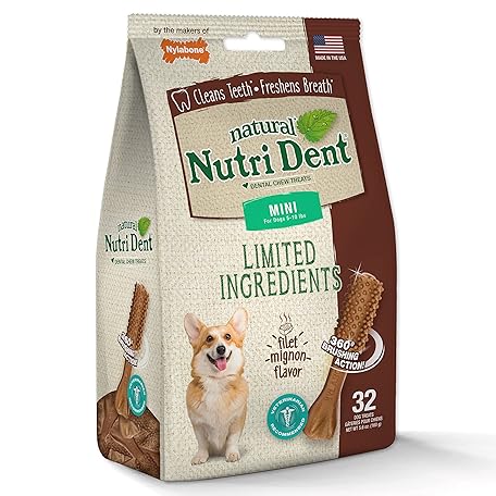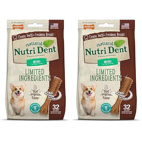 • Nylabone Nutri Dent Dog Dental Chews - Natural Dog Teeth Cleaning & Breath Freshener - Dental Treats for Dogs - Filet Mignon Flavor, Mini (32 Count) (Pack of 2)