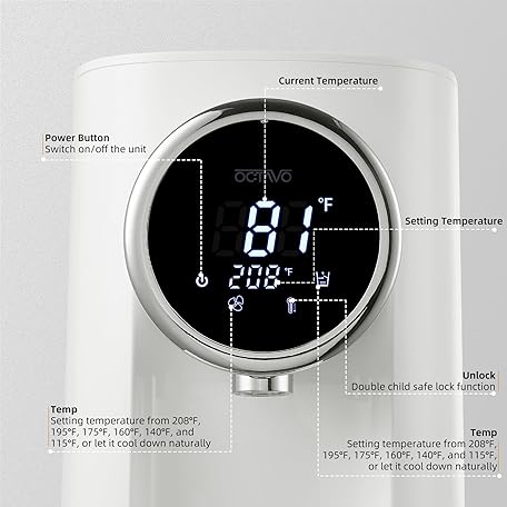 Thông tin sản phẩm OCTAVO Water Boiler & Warmer 5 Liter, 304 Stainless Steel Water Tank, 700 Watt 6 Adjustable Water Temperature, LCD Touch Control Screen, Child Lock with Water Shortage Indicator