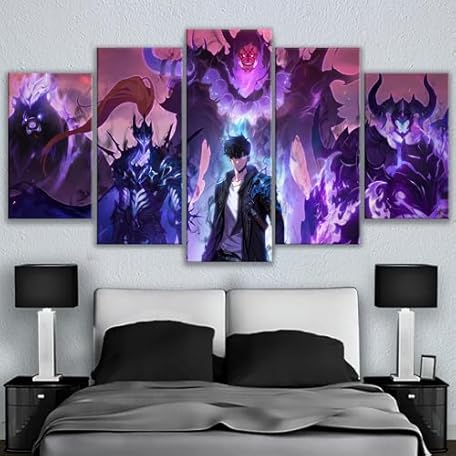 Oil Painting Canvas Framed Art Anime Wall Colorful Set of 5 Ready To Hang Different sizes (Solo Leveling, 39x22inch, Framed)