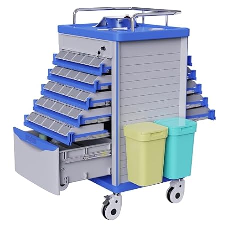 OLERN Medication Bins Cart with 200 Bins and Drawer - Dual-Sided Open, 50 Medicine Boxes, Silent Casters, Movable Container, 2 Trash Bin-Medical Crash Cart for Clinic, Hospital and Lab, Factory
