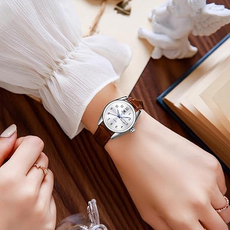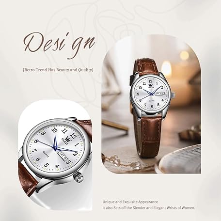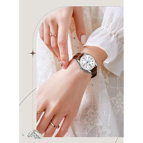 OLEVS Elegant Women's Watch Brown Leather Chronograph Watches for Women Medium Dial Fashion Dress Women Watch Waterproof Quartz Female Wristwatch Day Date Diamond Retro Watch for Women