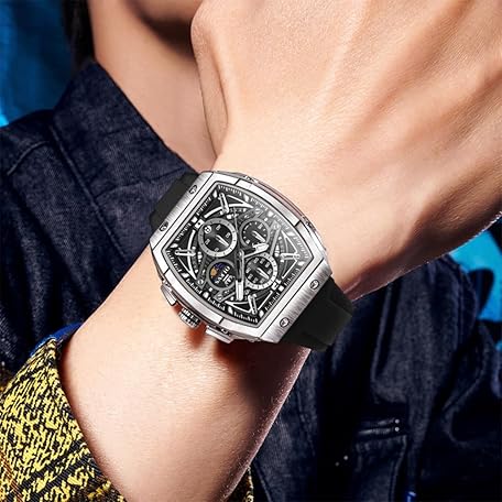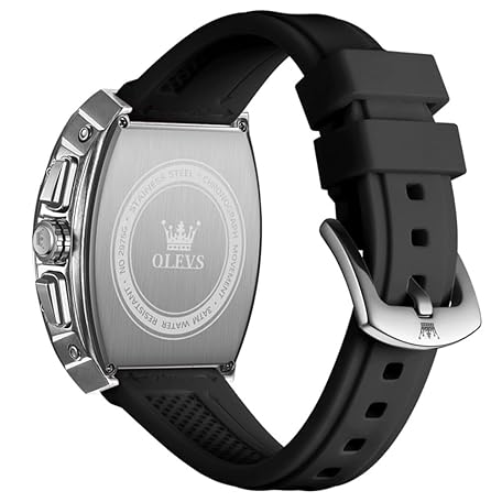 OLEVS Men Watches Business Dress Chronograph Big Square Quartz Analog Male Watch Silicone Strap Waterproof Date Gift Mens Wrsit Watch Silver