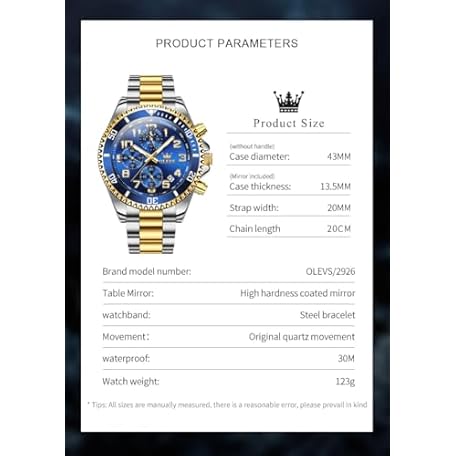 Thương hiệu OLEVS là cái tên nổi tiếng được rất nhiều khách hàng trên thế giới chọn lựa. Với kiểu dáng đẹp mắt, sang trọng, sản phẩm OLEVS Mens Watches Chronograph Luxury Dress Moon Phase Two Tone Stainless Steel Waterproof Luminous Business Calendar Wrist Watch là sự lựa chọn hoàn hảo nếu bạn đang tìm mua một món cho riêng mình.