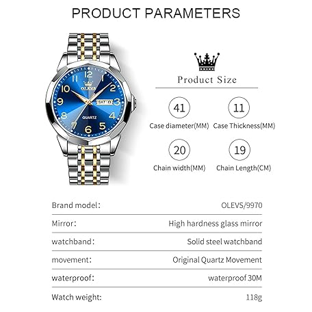 Thương hiệu OLEVS là cái tên nổi tiếng được rất nhiều khách hàng trên thế giới chọn lựa. Với kiểu dáng đẹp mắt, sang trọng, sản phẩm OLEVS Watch for Men Luxury Dress Analog Quartz Stainless Steel Waterproof Luminous Date Diamond Business Two Tone Casual Wrist Watch là sự lựa chọn hoàn hảo nếu bạn đang tìm mua một món cho riêng mình.