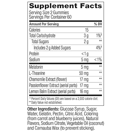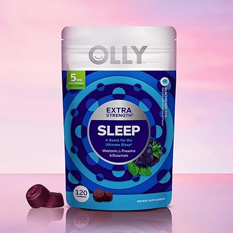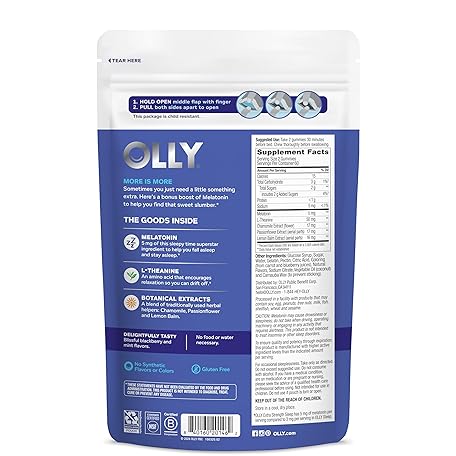 Thông tin sản phẩm OLLY Extra Strength Sleep Gummy, 5 mg Melatonin, L-Theanine, Chamomile, Lemon Balm Extracts, Sleep Aid, BlackBerry Flavor - 120 Count