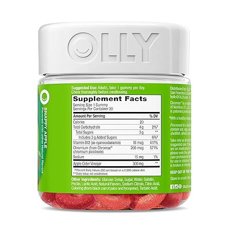 Thông tin sản phẩm OLLY Metabolism Gummy Rings, Apple Cider Vinegar, Vitamin B12, Chromium, Energy and Digestive Health, Chewable Supplement, Apple Flavor - 30 Count