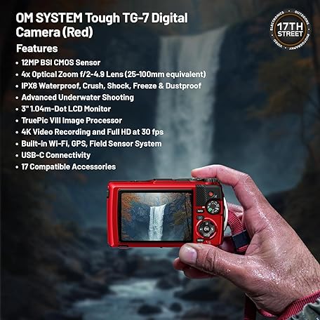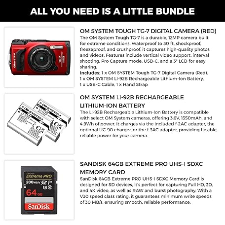 Thông tin sản phẩm OM System Tough TG-7 Digital Camera - Red | Waterproof 12MP Outdoor Adventure Camera w/ 4K Video, Travel for Hiking, Snorkeling w/Extra Rechargeable Li-ion Battery & 64GB Memory Card Bundle