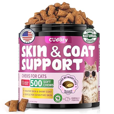 Omega 3 for Cats - 500 Skin & Coat Health Crunchy & Creamy Chews with Omega 3, Biotin & Vitamin E for Healthy Skin, Shiny Fur, Cat Supplements & Vitamins -Chicken Flavor