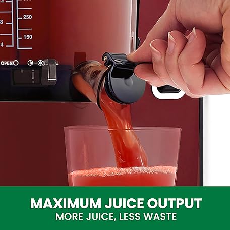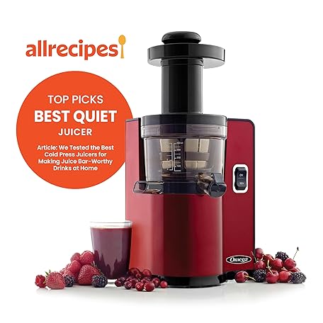 Thông tin sản phẩm Omega Juicer Cold Press Vertical 43 RPM Slow Masticating Compact Juice Extractor for Fruits and Vegetables Quiet Operation with 3 Stage Auger Automatic Pulp Ejection and No-Drip Tap, 150-Watts, Red