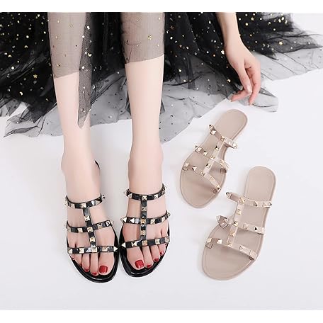 OMGard Women Flats Sandals, Studded Jelly Shoes Size 9 Red Dressy Summer Beach Rivets Strappy Jellies Slide Slip On Open Toes