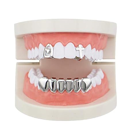 OOCC 2 Single Heart Cross Shape Top Grillz Teeth & 6 Bottom Set Grillz, Gold Plated Brass, Dental Grills, Teeth Jewelry, Unisex, Adults, Fashion-conscious, Trend-aware